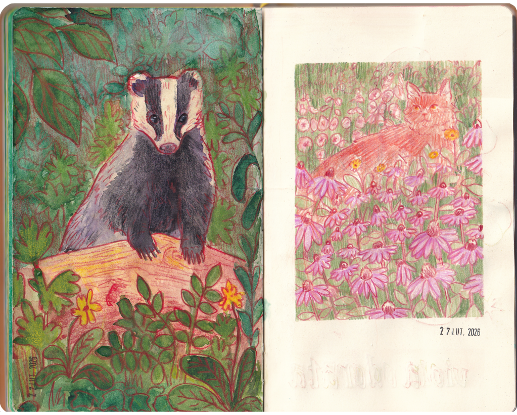 In february I didn’t draw as much as I would have wanted, but I did couple of paintings in my sketchbook. At the end of the month I’ve started to feel upcoming spring and it shows in my sketches – I had a need to paint some meadows, but nothing elaborate – just quick lazy drawings, my attention span wasn’t the best so an 1 hour long sketchbook session was my limit.
